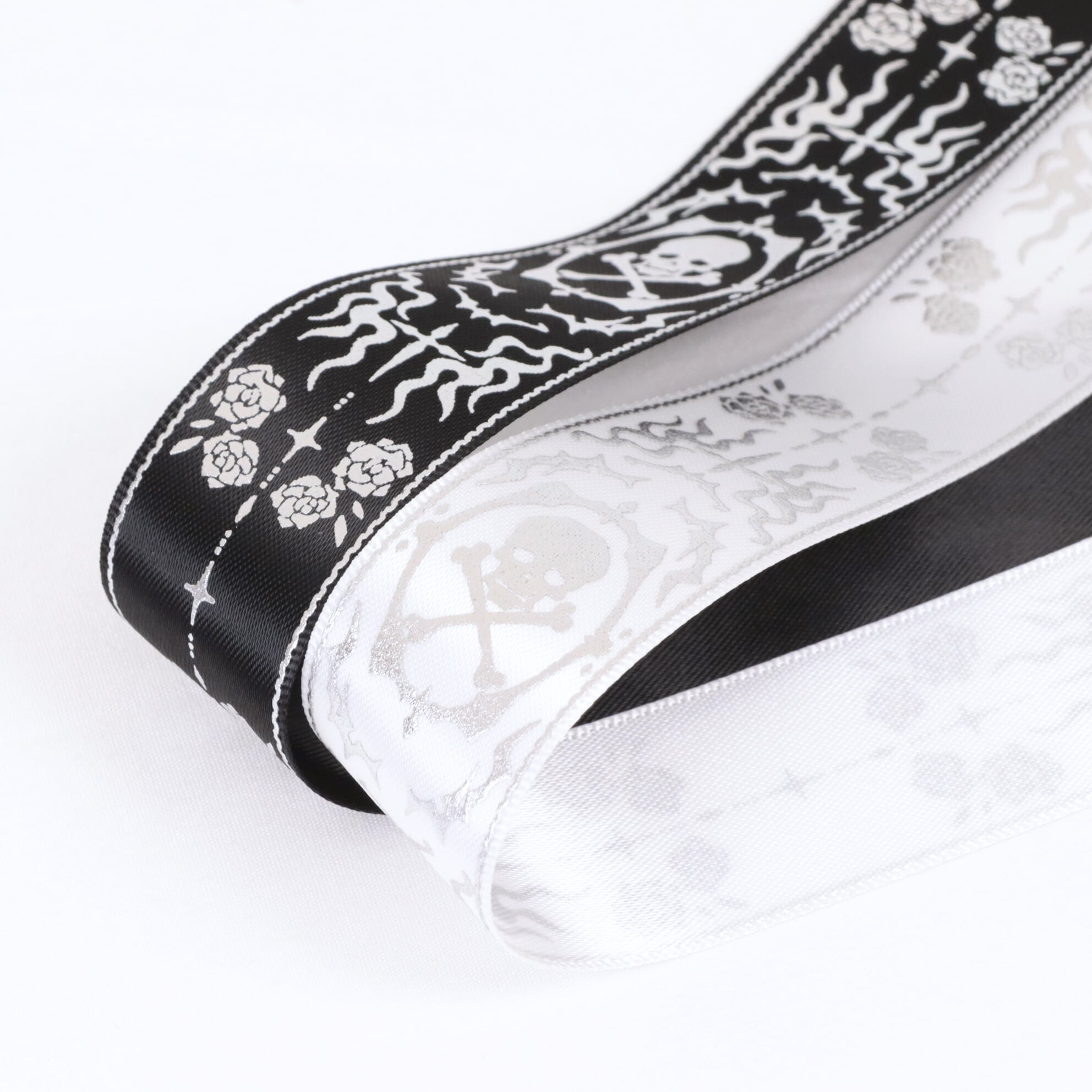 全色セット【ISEKIオリジナル】スカル 薔薇 十字架 柄 サテン リボン 幅約25mm 布 プリント シルバー 01020064 ハンドメイド 資材 装飾 飾り ロゼット 硬質カード デコ | リボンとパーツのお店 ISEKI オンラインショップ