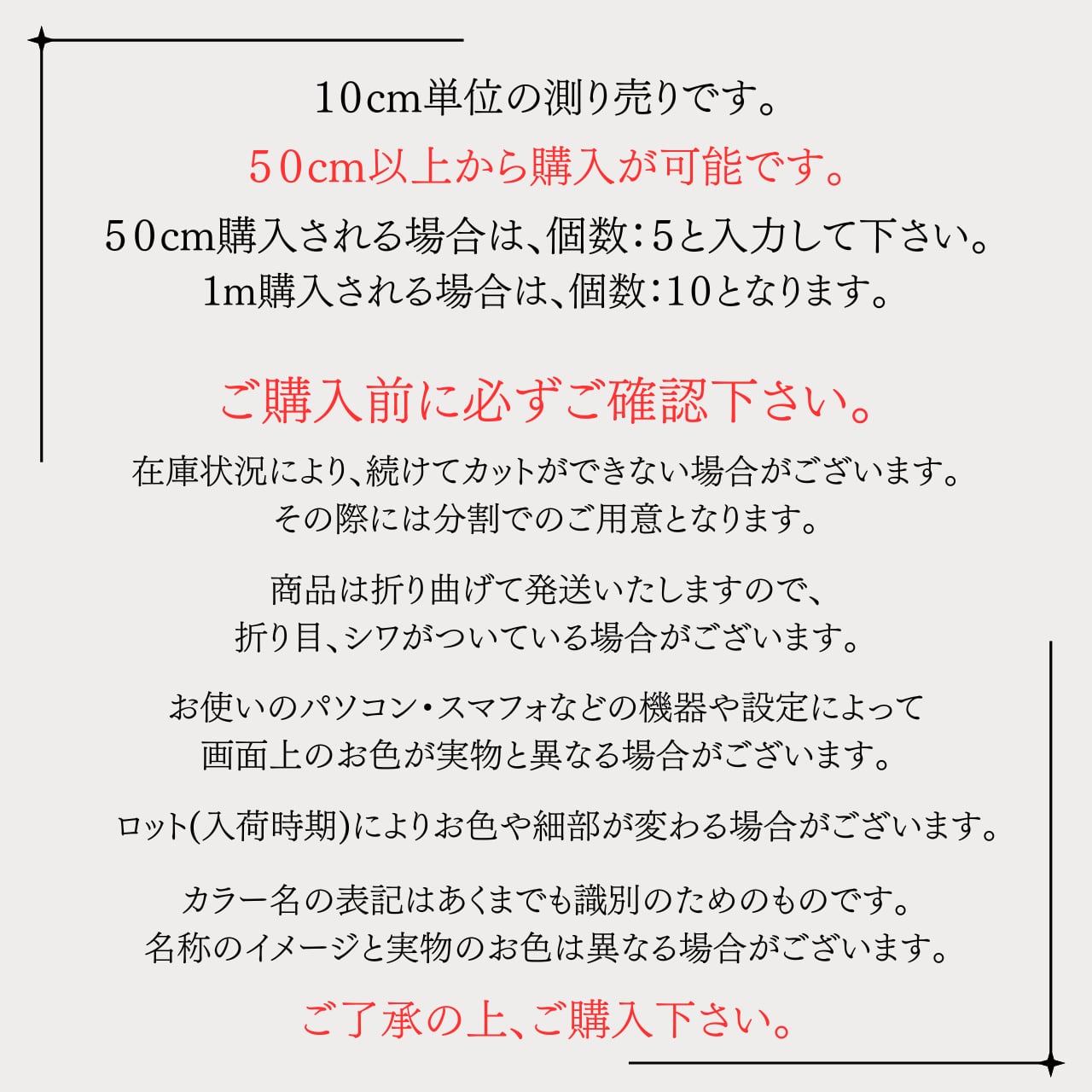 長さ:50cm以上から購入可能。購入数量に応じて裁断します。