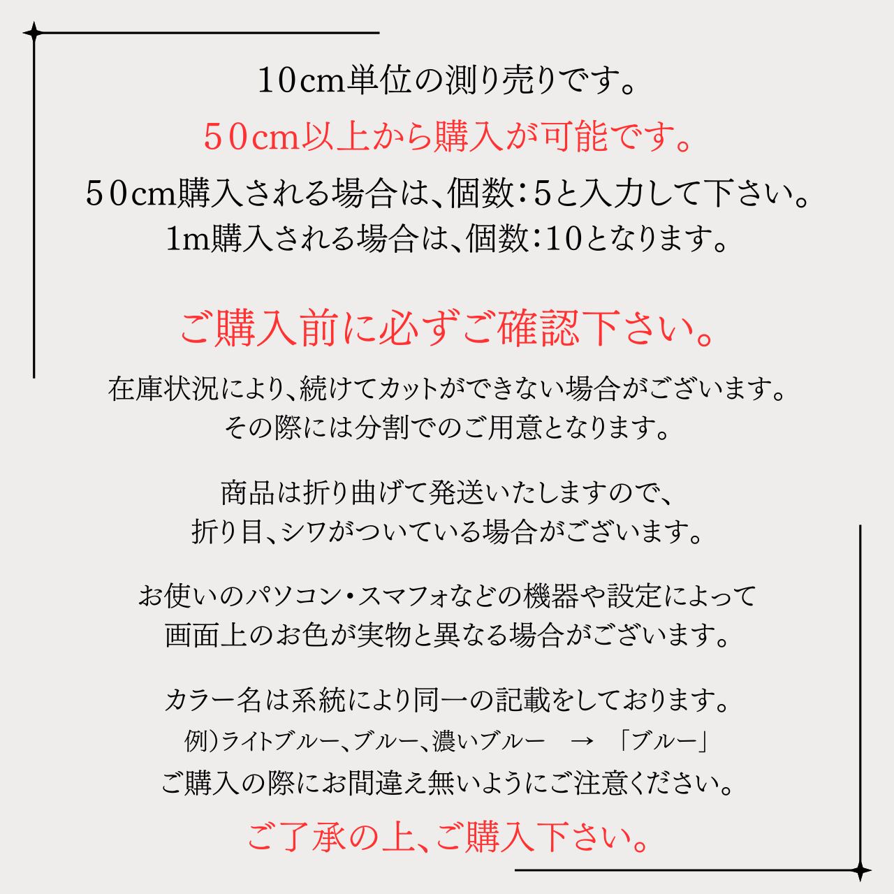 長さ:50cm以上から購入可能。購入数量に応じて裁断します。
