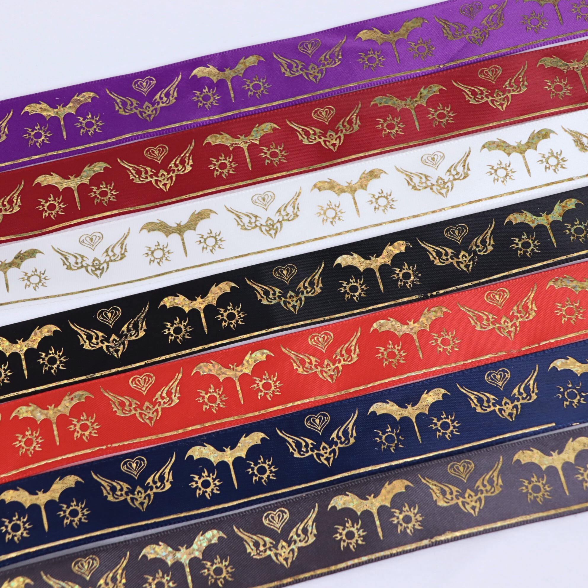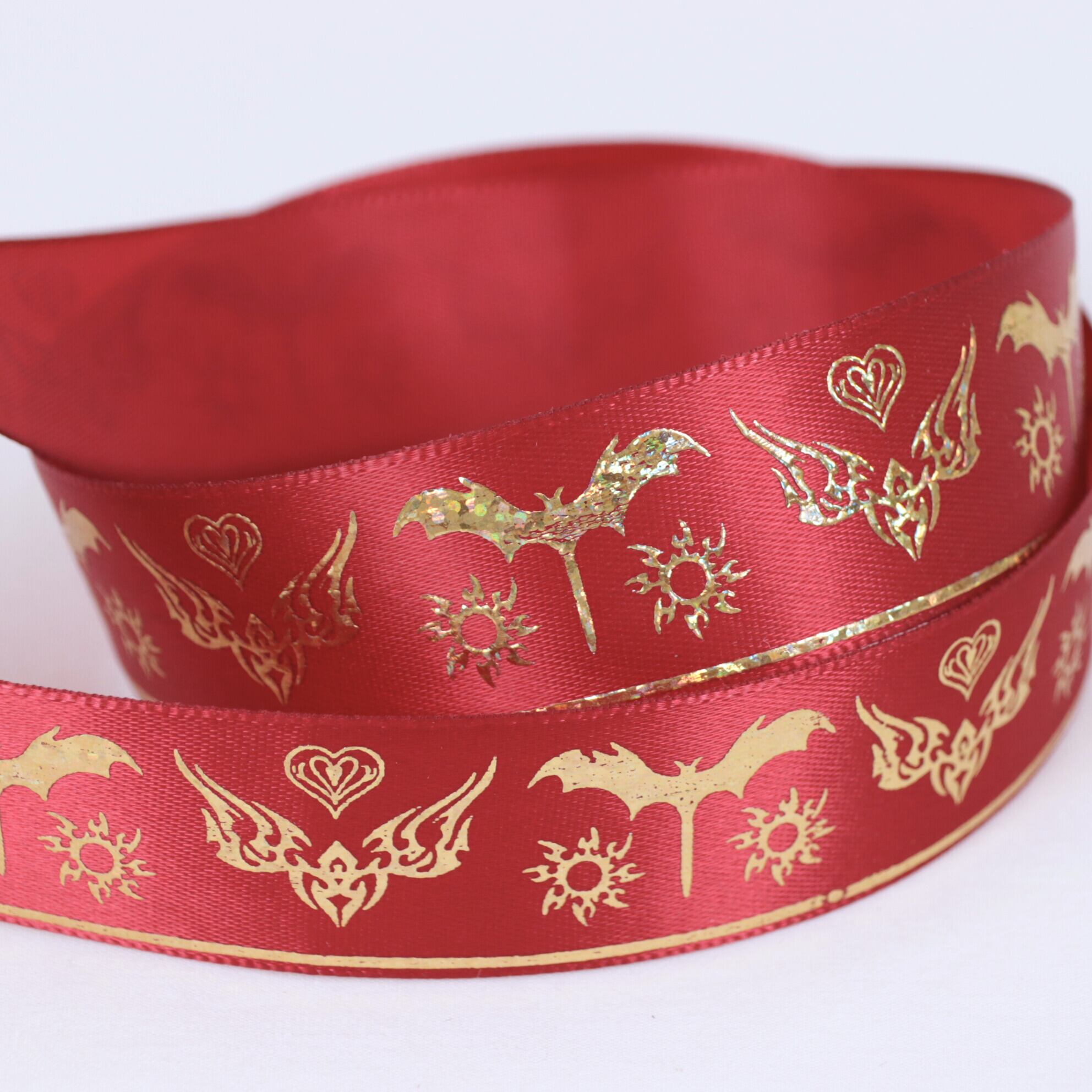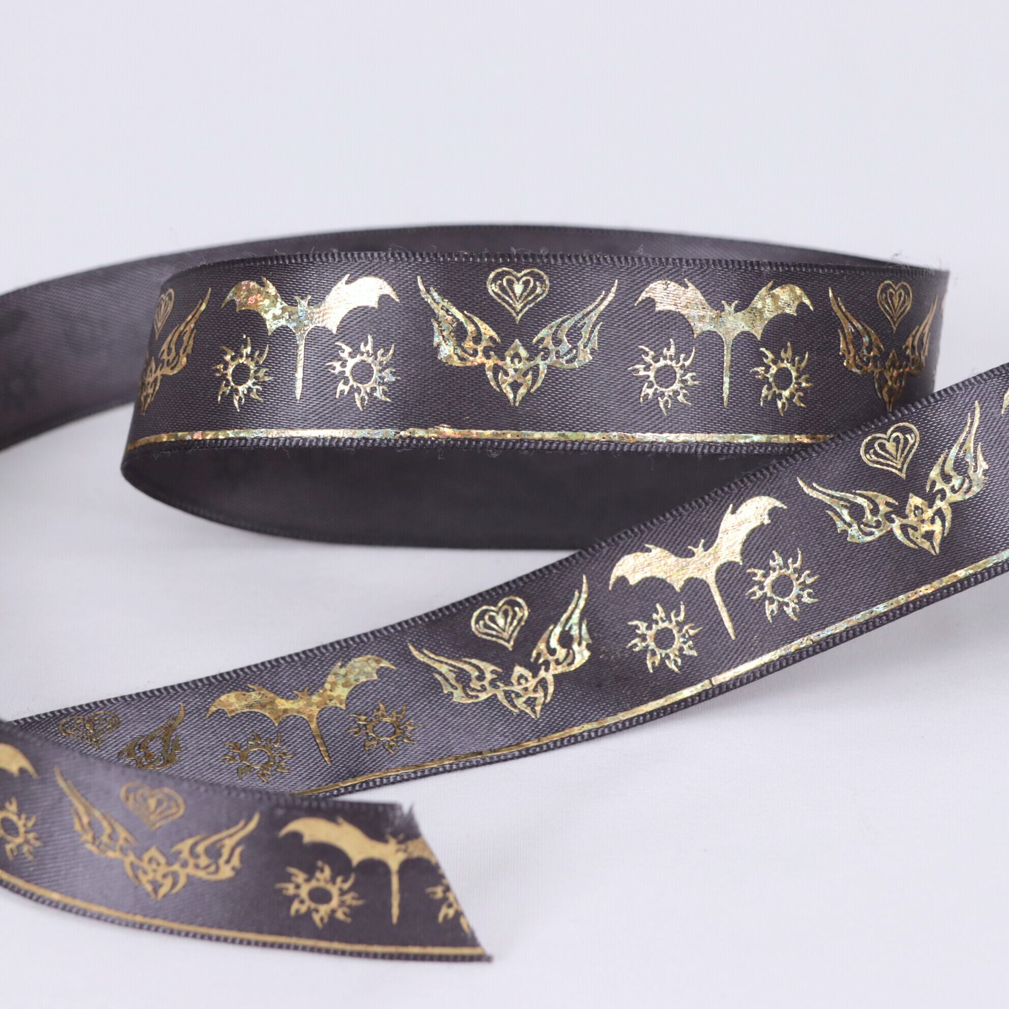 コウモリ柄 サテン リボン 幅約25mm 布 プリント ゴールド ダーク系 01020012 ハンドメイド 資材 装飾 飾り ロゼット 硬質カード デコ | リボンとパーツのお店 ISEKI オンラインショップ