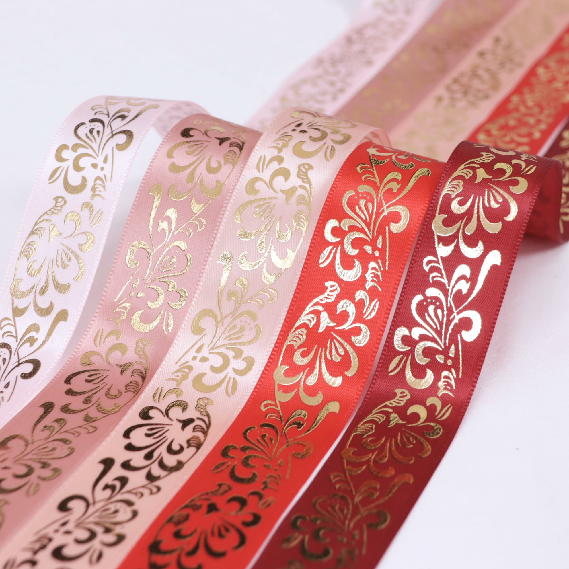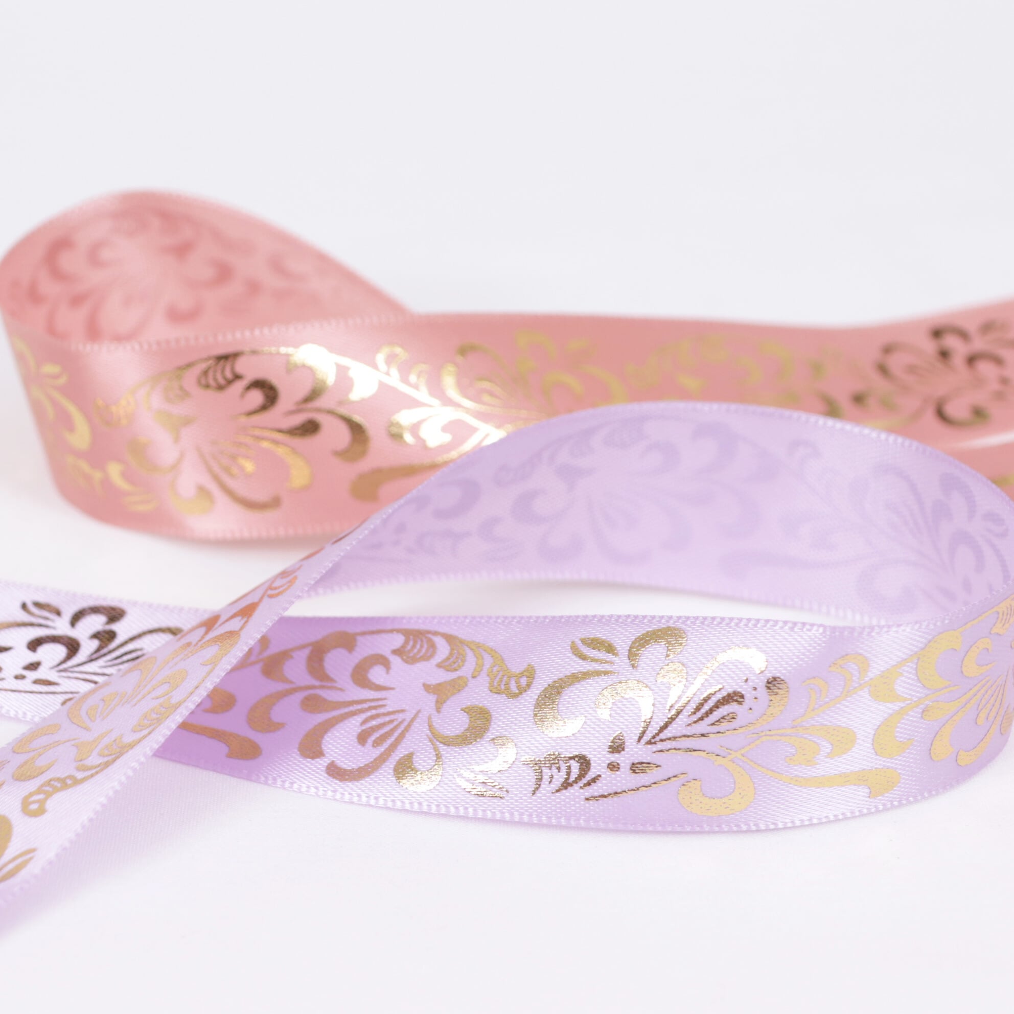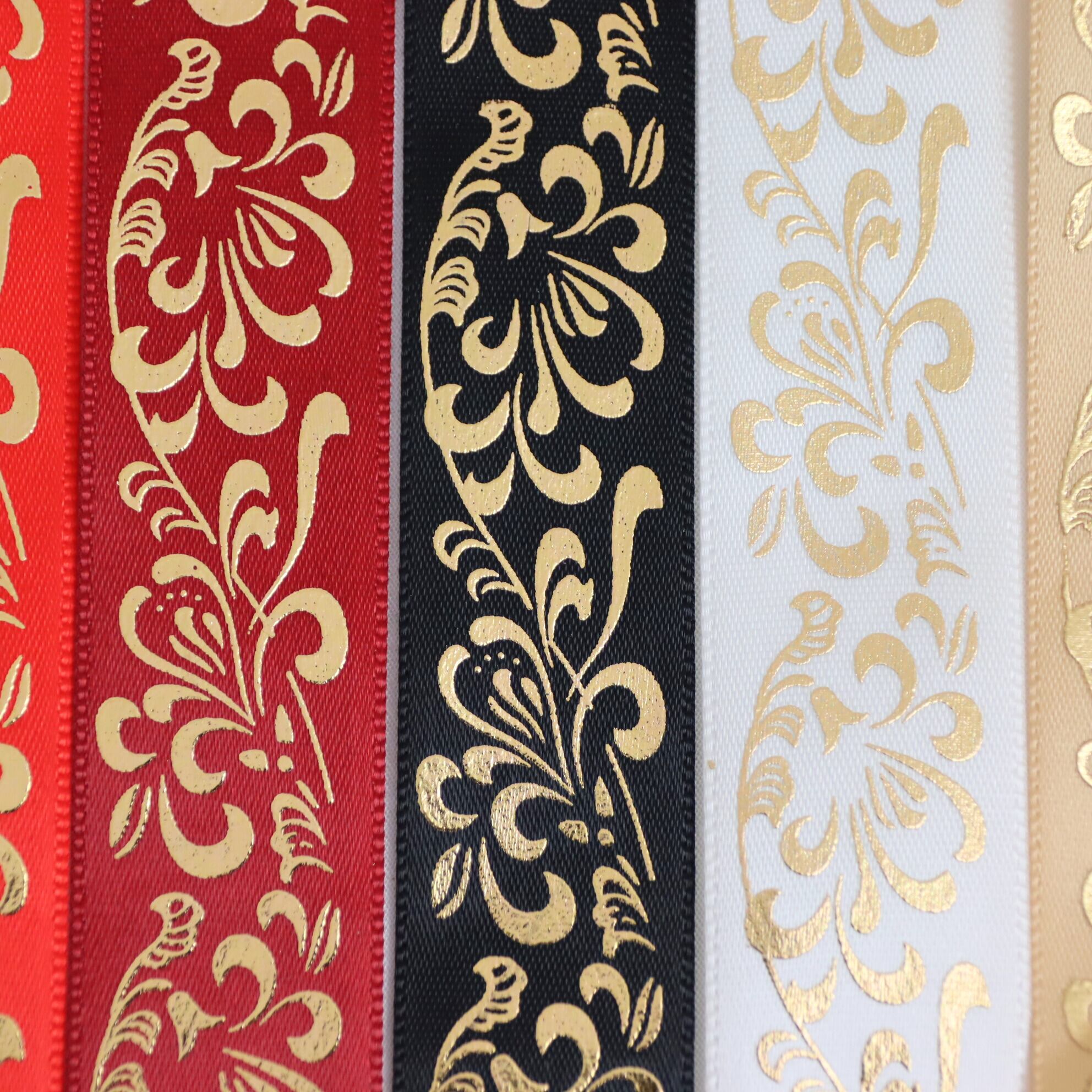 蔓模様柄 サテン リボン 幅約25mm 布 プリント ゴールド 01020017 ハンドメイド 資材 装飾 飾り ロゼット 硬質カード デコ