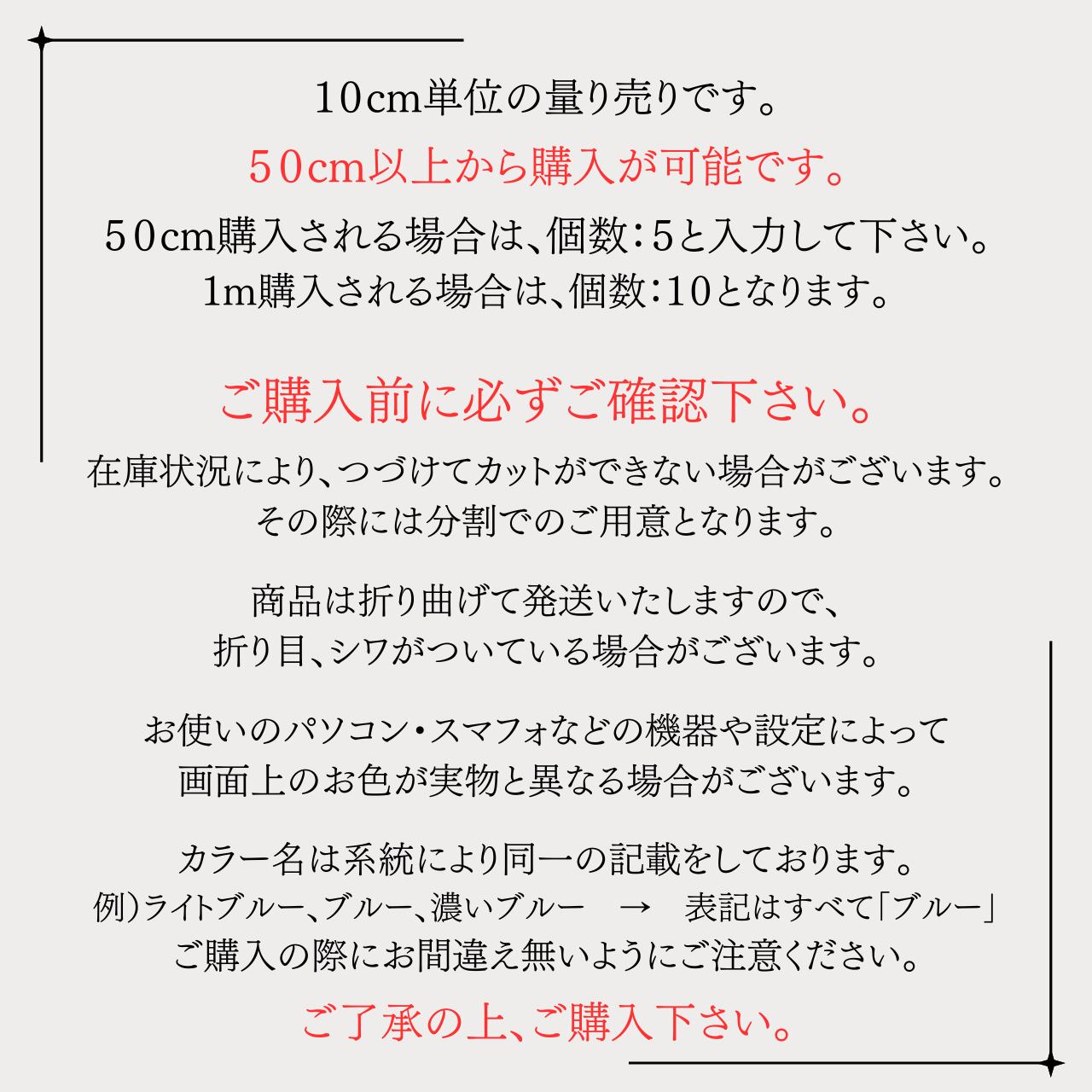 長さ:50cm以上から購入可能。購入数量に応じて裁断します。