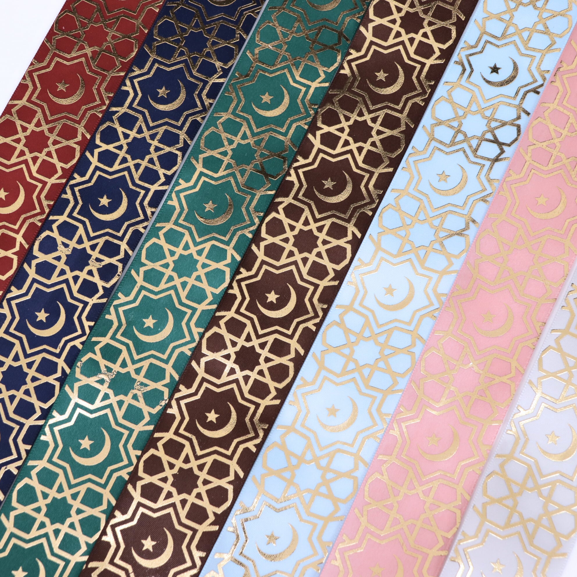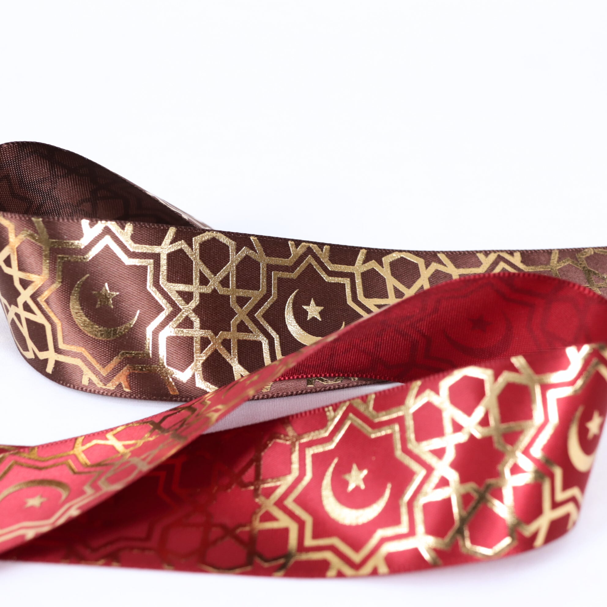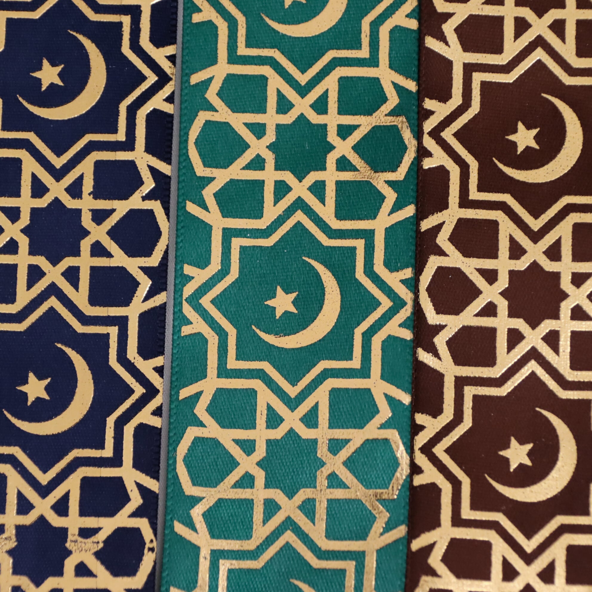 アラベスク柄 サテン リボン 幅約38mm 布 プリント ゴールド 月 星 01020028 ハンドメイド 資材 装飾 飾り ロゼット 硬質カード デコ | リボンとパーツのお店 ISEKI オンラインショップ